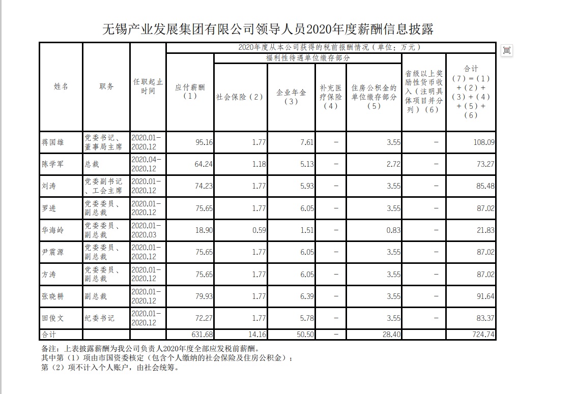 國企負(fù)責(zé)人薪酬信息(無錫產(chǎn)業(yè)發(fā)展集團(tuán)有限公司2020年度)